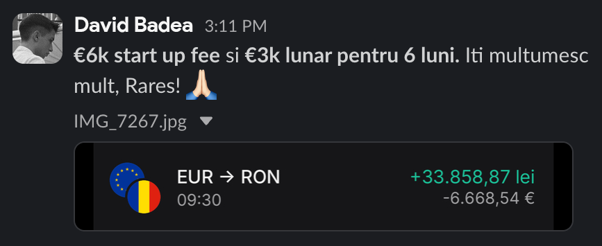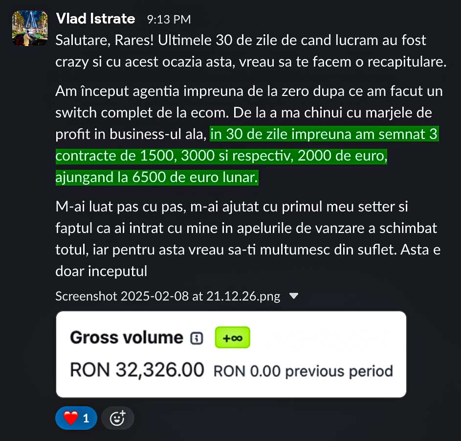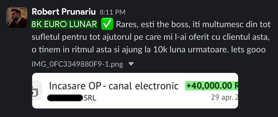 "Fac 8K euro lunar acum. Rareș mi-a ajutat enorm cu clientul ăsta. Dacă merg în ritmul ăsta, ajung la 10K luna viitoare. Cea mai bună decizie pe care am luat-o."
