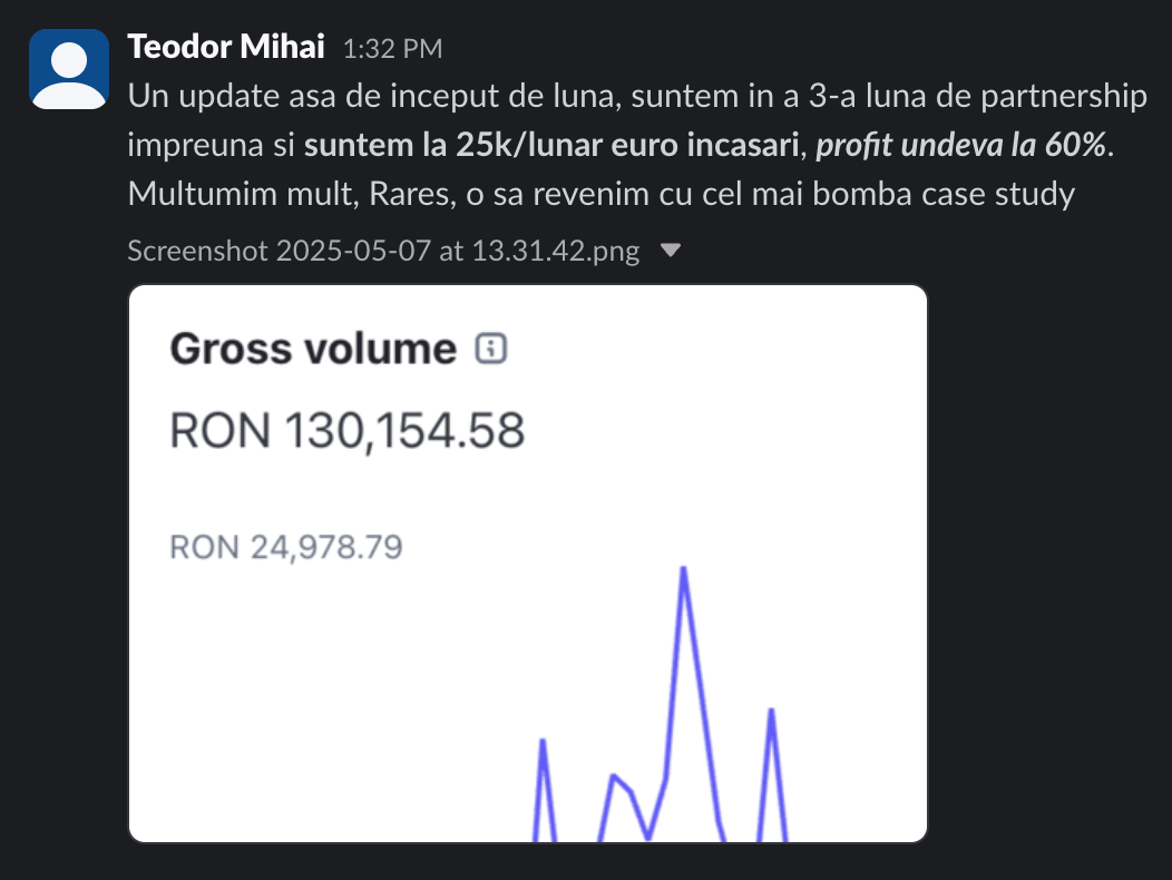 "Suntem în a 3-a luna de partnership împreuna și suntem la 25k/lunar euro încasări, profit undeva la 60%. Mulțumim mult, Rareș, o sa revenim cu cel mai bomba case study."