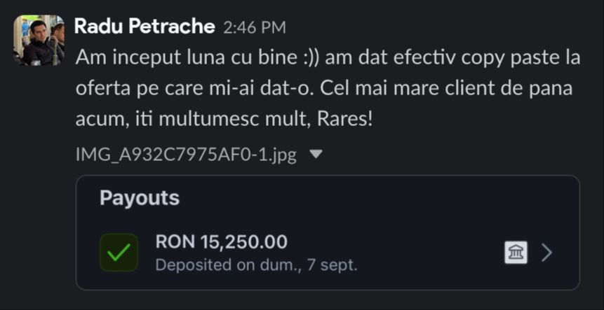 "Am dat literalmente copy-paste la oferta pe care mi-a dat-o Rareș și am semnat cel mai mare client de până acum - 15,250 RON. Am început luna cu bine!"